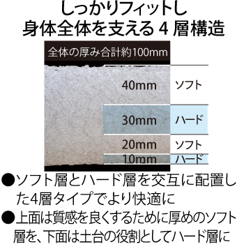 多段層で、沈み込みを3つのエリアにすることでフィット感を自分好みにカスタマイズできます。